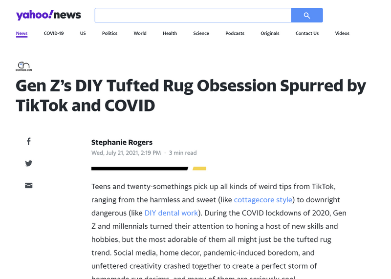 If your style leans more toward midcentury modern than anime, you’ll want to check out Tim Eads @tufttheworld, a designer who founded an online community for tufters and started selling tufting guns and yarn back in 2018. TikTokers eager to participate in the new trend often flock to Eads’ website TuftingGun.com to order supplies, get help, and discuss the craft in greater detail than a social media comments section allows.