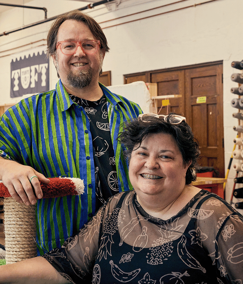 Tiernan Alexander and Tim Eads are Texas-born artists and business owners living and working in West Philadelphia. In 2018 they started Tuft the World, which provides tufters the high-quality tools, materials, and instruction they need to make their own incredible projects. They have led tufting workshops across North America and collaborated with industry leaders in rug design and carpet manufacturing. Alexander holds an MA from the prestigious Winterthur Program in American Material Culture and an MFA from the University of the Arts in Philadelphia. Along with being a gifted tufter, Eads is a master printer and holds an MFA from Cranbrook Academy of Art.